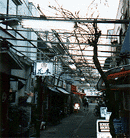 これは瓢箪池に面した藤棚の下で、主人公の猟奇者青木愛之助が、「奇跡のブローカー」と称する不思議な美少年に話し掛けられる場面です。このくだりで乱歩は、奥山から見世物小屋、木馬館、そして花やしきといった浅草公園が醸し出す怪しい魅力を伝えています。ところでこの写真は現在の初音小路の藤棚です。位置的にはこのあたりが、作中の瓢箪池の藤棚ではないでしょうか。小さな飲み屋やパチンコの景品交換所などがひっそりと並んでいます。5年くらい前にはまだ流しのおじいさんが白いブレザーを着て、店から店へとギターをかかえて渡り歩いていました。