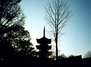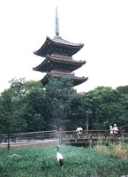 この五重塔は国の重要文化財で寛永16年(1639)に造営されました。現在は上野動物園の中に建っています。動物園の中にニョッキリと古い五重塔が建っているのは不思議な光景で、とくに動物園のこのあたりは鶴が放し飼いになっていて、五重塔をバックに鶴が羽ばたいているところなんかを目の当たりにすると、極楽浄土(?)にいるような気分になれます。ところで、この五重塔は注意してみると面白いつくりになっていて、五階部分の屋根は銅の板張りなんですが、それ以外の階は瓦葺きなのです。鶴の羽ばたく五重塔を前にして、マニアックな会話を楽しみたいかたは是非利用して下さい。